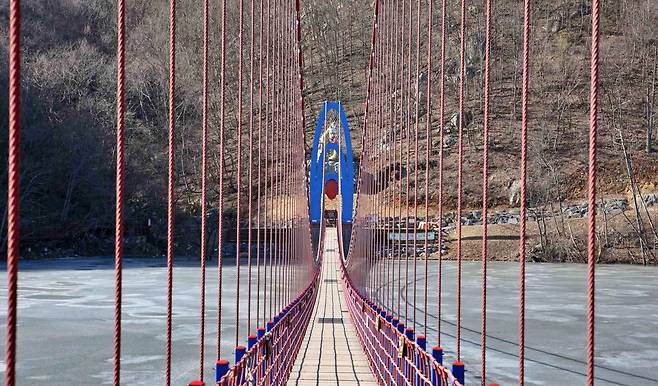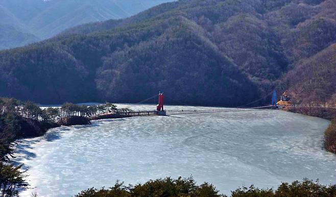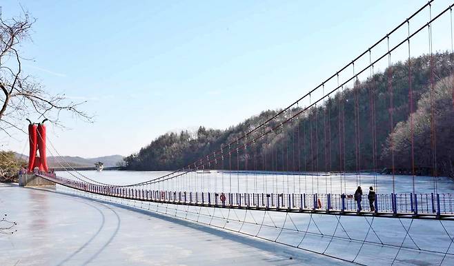 충남 청양의 천장호 출렁다리는 겨울이 오면 더욱 극적인 풍경을 만들어 여행객들의 발걸음을 사로잡는다.