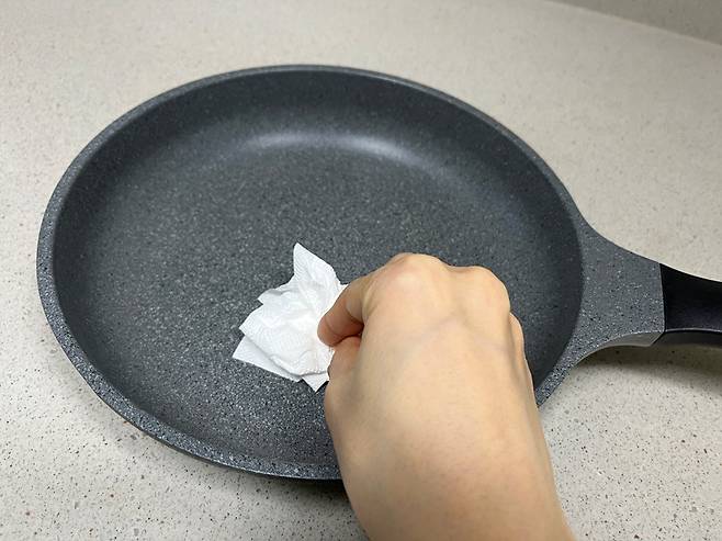 이후 후라이팬을 가열해 물기를 날린 뒤, 표면에 식용유를 얇게 펴 바르고 가열하는 작업을 3~4회 반복하는 게 핵심인데요.