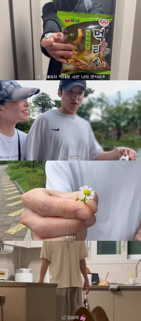 김가은은 그런 윤선우를 넷플릭스 드라마 '폭싹 속았수다'에 등장하는 사랑꾼 관식(박보검 분)에 비유하며 '내 최애과자 먹태깡 사온 나의 관식이'이라는 설명을 자막으로 적었다.