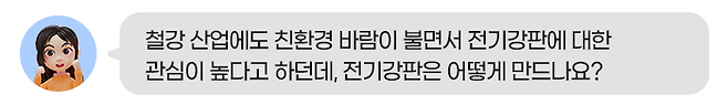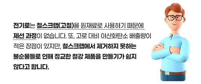 고로 방식은 원재료인 철광석과 원료탄(석탄)이 소결과 코크스라는 가공 과정을 거친 다음 용광로에 주입되고 주조 공정을 통해 철강을 만드는 방식입니다. 전기로 방식은 철스크랩(고철)을 전기로에 넣은 뒤 녹여서 쇳물을 만들어 철강을 만드는 방식입니다.