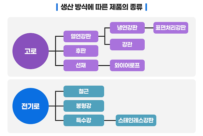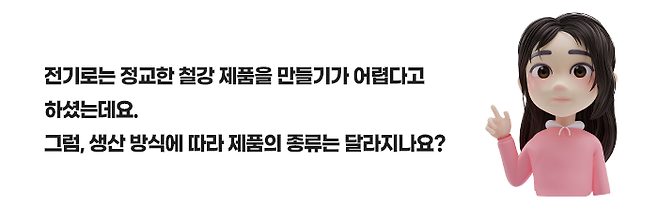 네. 맞습니다. 고로 방식과 전기로 방식에 따라 만들어지는 제품의 종류가 다른데요. 고로에서는 주로 열연강판, 냉연강판, 강관, 후판, 선재 등을 만들며, 전기로에서는 철근, 봉강, 형강, 특수강 등을 만듭니다.