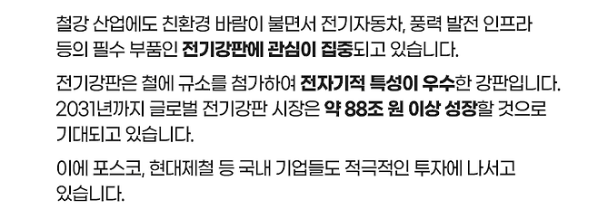 하지만, 친환경 바람을 타고 전기자동차, 풍력 발전 인프라에 필수 부품인 전기강판으로 인해 다시 주목받고 있는데요. 오늘은 ‘산업의 쌀’의 원조로 불리는 철강 산업에 대해 자세히 알아보겠습니다.