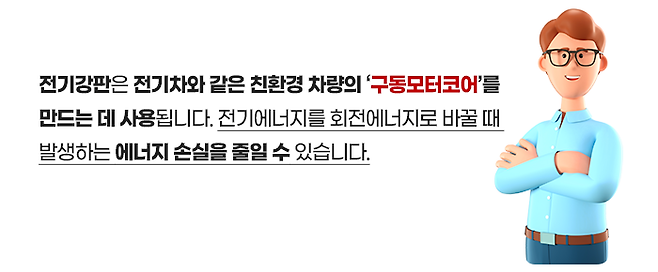 전기강판은 강철에 규소(Silicon)를 1%~5% 첨가하여 제조합니다. 전기강판은 전자강판 또는 규소강판이라고도 하는데, 일반 강판에 비해 규소 함유량이 많고 우수한 전기적, 자기적 특성을 가진 강판입니다.