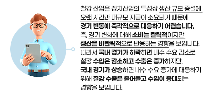 철강 산업은 경기에 민감한 영향을 받는 특성이 있습니다. 그래서 철강 경기를 보기 위해서는 철강 수요 산업인 건설, 조선, 자동차, 가전, 방위 산업 등 전방산업의 수요 침체가 있는지를 살펴야 합니다.
