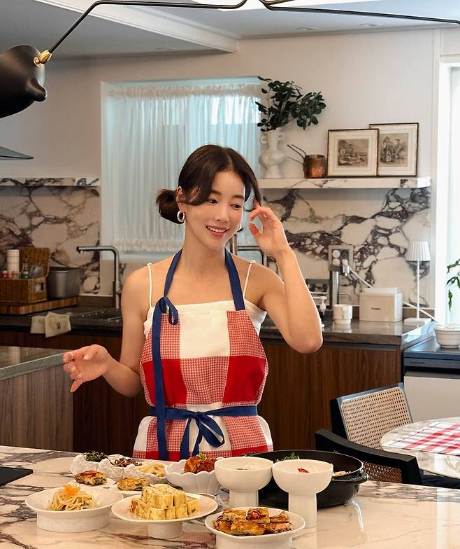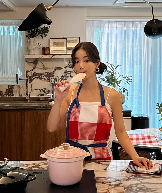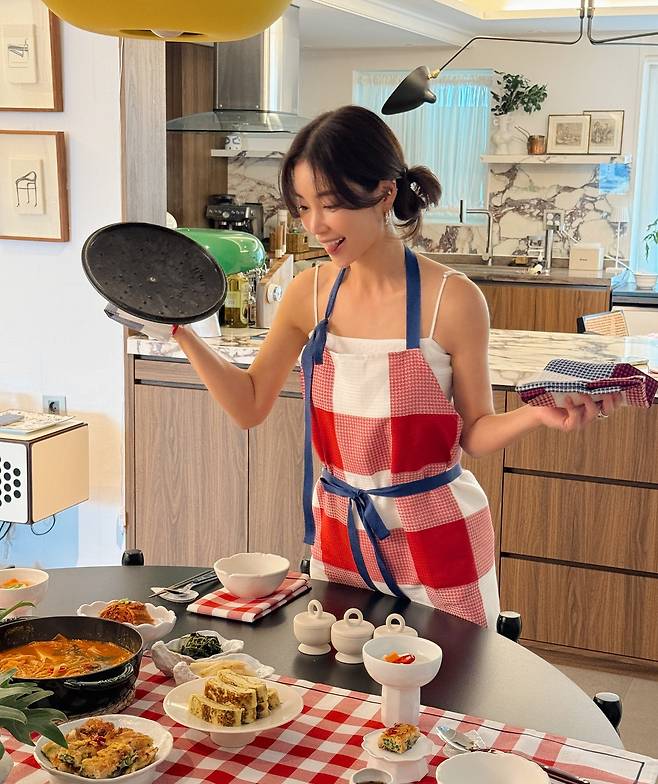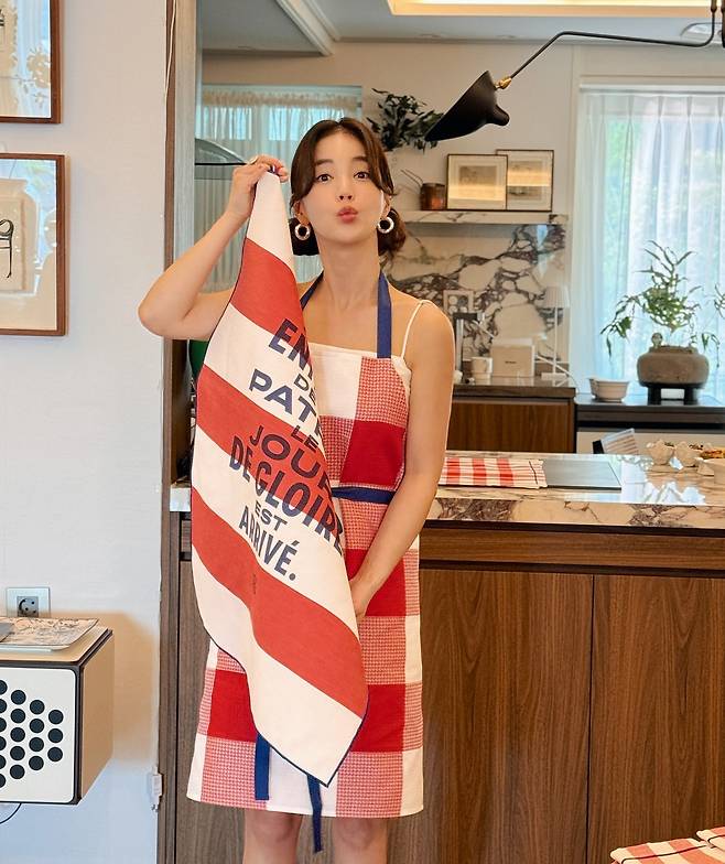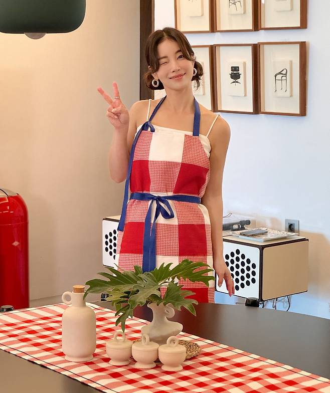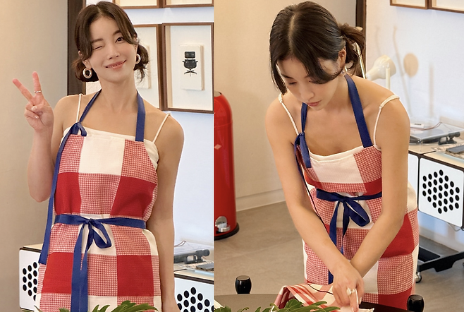 사진 속 기은세는 레드 체크 앞치마를 입고 세련된 요리사의 면모를 보여줬습니다.