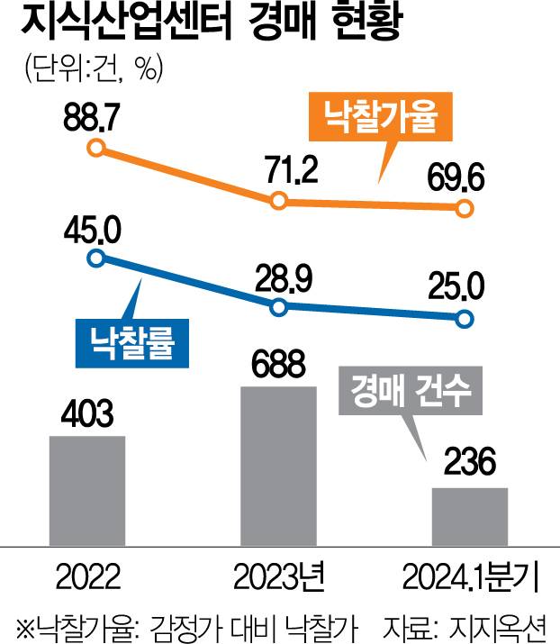 법원경매에 나온 지식산업센터의 낙찰률은 2022년 45.0%에서 2023년 28.9%, 올해는 25.0%까지 하락했다.