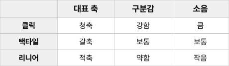 클릭 방식은 구분감이 있고, 소리가 큰 방식이고, 택타일 방식은 구분감이 있지만, 클릭 방식보다 소리가 작습니다. 리니어는 구분감은 없지만 소리가 가장 작습니다.