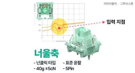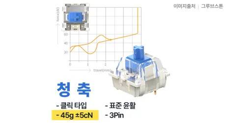 흔히들 청축보다 조용한 키보드를 원하지만, 구분감은 느끼고 싶을 때 사면 좋은 스위치라고 평가하며, 맨 처음 기계식 키보드에 입문할 때 추천하는 축이기도 합니다.
