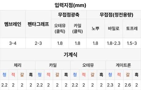 키압이 무게를 의미하는 것이라면, 입력지점은 키를 어느정도 깊이까지 눌렀을 때 입력되느냐를 의미하는 것으로 mm단위로 표기하며 낮은 제품이 1mm 내외, 깊은 제품은 3mm가 넘어가기도 합니다.