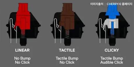 클릭 방식은 구분감이 있고, 소리가 큰 방식이고, 택타일 방식은 구분감이 있지만, 클릭 방식보다 소리가 작습니다. 리니어는 구분감은 없지만 소리가 가장 작습니다.
