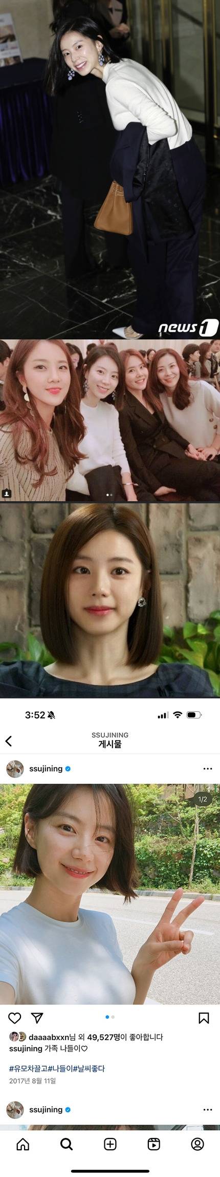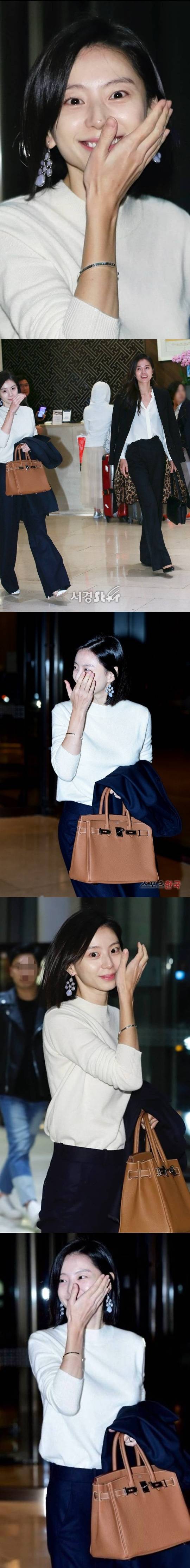 아이보리 니트와 검은 슬랙스, 연보라색 귀걸이와 버킨백을 매치한 하객룩은 과하지 않게 고급스러웠고, 억지스러운 포인트 없이 깔끔하게 정리된 스타일이었다.