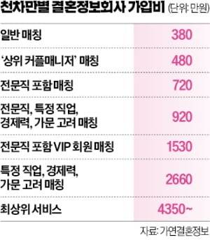 상위 1% 결혼정보회사의 여성 회원 가입비는 300만원대부터 시작한다. 매칭 횟수는 약 5회. 같은 조건으로 남성 회원은 최소 1000만원대부터 시작한다. 업계 관계자는 “남성 회원이 상위 1%의 능력을 갖췄다고 해도 금액이 보통 수천만원대이기 때문에 처음엔 가입을 망설이는 분이 많다”고 말했다.