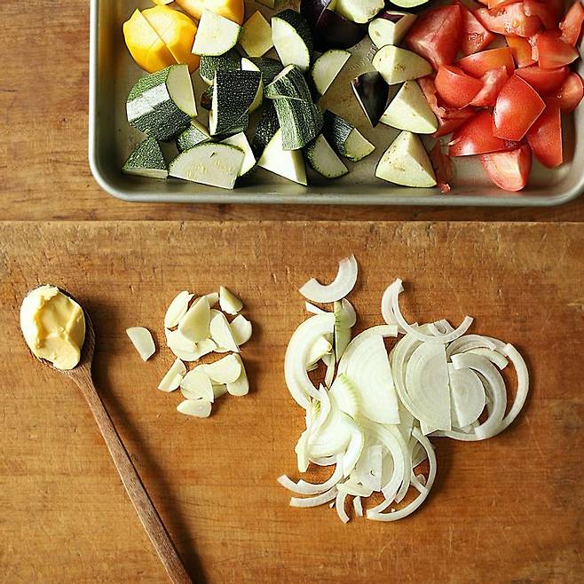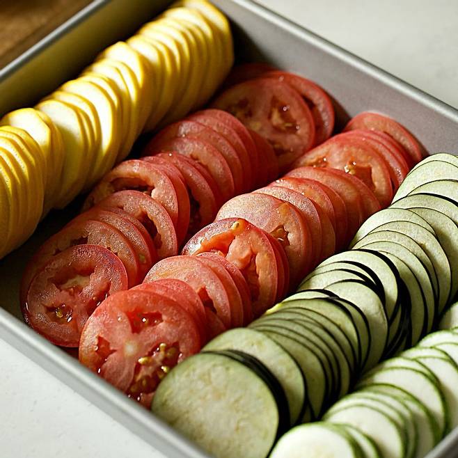 만드는 과정도 복잡하지 않습니다. 우선 가지, 호박, 토마토 등 알록달록 색감의 채소를 동글동글하게 자릅니다. 토마토소스와 올리브 오일, 소금, 후춧가루 등으로 간을 맞춥니다. 재료를 오븐에 구워서 만들면 완성입니다.