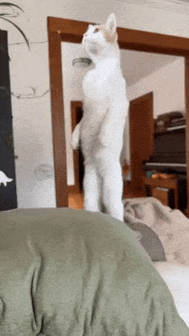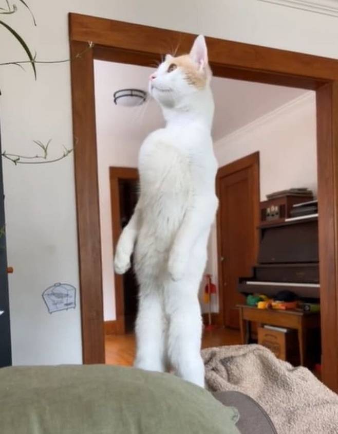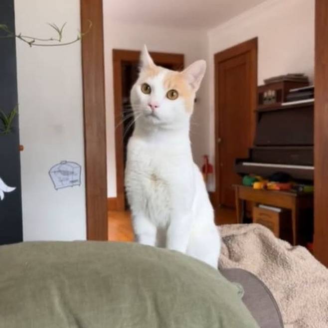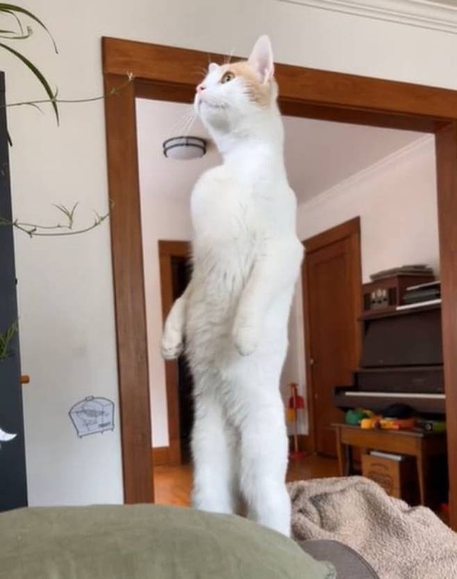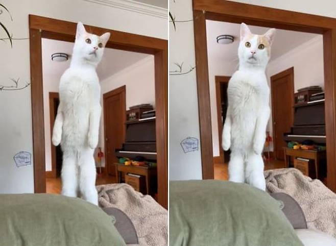 사연은 이렇습니다. 고양이를 키우고 있다는 집사는 SNS를 통해 침대 위에서 두 다리로 벌떡 일어선 고양이 모습이 담긴 영상을 찍어 올렸죠.