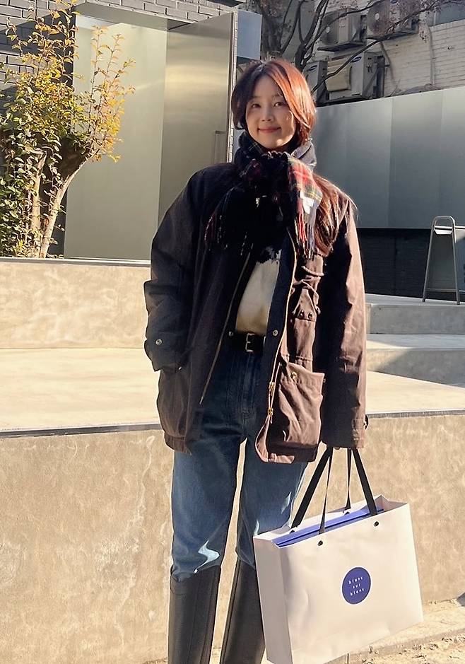 한지혜는 17일 자신의 채널에 “his barbour jacket”이라는 글과 함께 남편의 재킷을 입고 외출에 나선 사진을 게재했다.