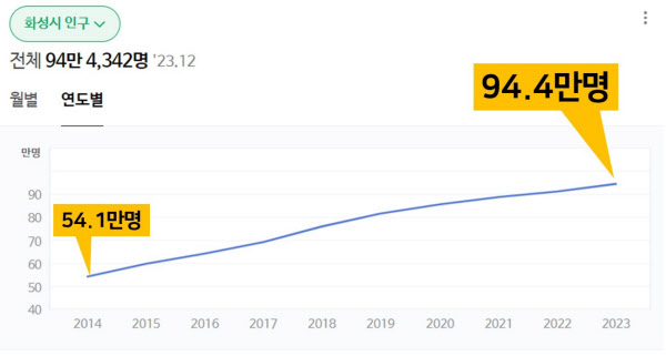 [땅집고] 전국 지자체가 인구 증가 대책에 골머리를 쓰고 있지만, 이 지역은 예외다. 바로 경기도 화성시다. 화성시는 동탄신도시를 조성하면서 2014년 54만명이던 인구가 지난해 약 100만명으로 2배가량 늘었는데, 특히 젊은 층 유입이 많았다.