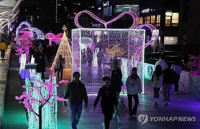 (부산=연합뉴스) 강선배 기자 = 3일 오후 부산 수영구 민락수변공원에서 열리고 있는 스토리텔링형 빛 축제인 '밀락 루체 페스타'에서 시민들이 다양한 빛 조형물을 감상하고 있다.