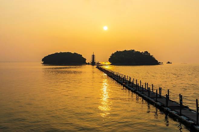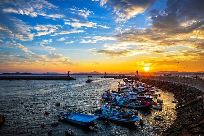 충청남도 당진의 왜목마을은 특별한 지형 덕분에 일출과 일몰을 모두 감상할 수 있는 유명한 명소다.