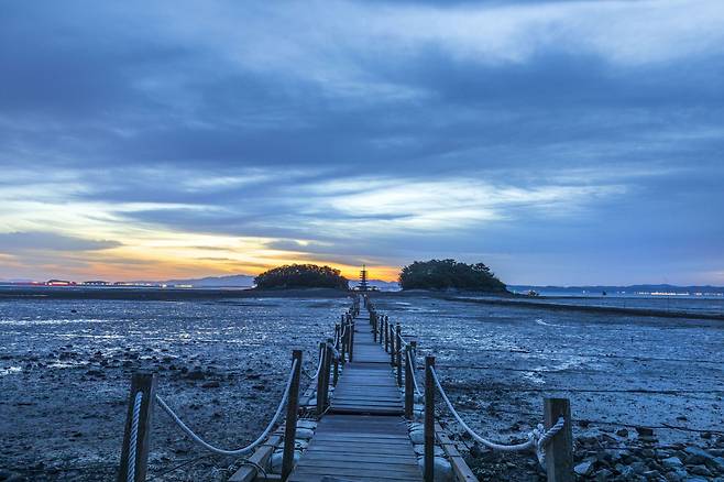 안면암의 주차장에서 차를 세우고 부교로 향하면, 갯벌을 지나며 아름다운 일출을 감상할 수 있는 방파제에 도달하게 된다.