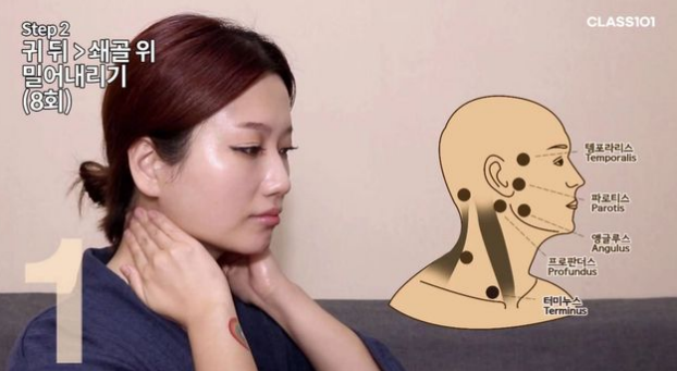 2. 턱 아래부터 귀 뒤까지 밀어 올리기 8회를 실시해 주세요. 턱 아래에 분포된 림프관 내의 노폐물을 귀 뒤로 배출되도록 유도하는 거예요.