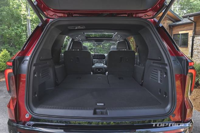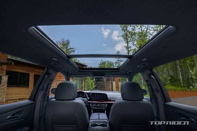 신형 트래버스 실내 공간은 기존보다 전반적으로 넓어졌다. 신형 트래버스 1열 레그룸은 최대 1125mm, 2열 레그룸은 최대 1053mm로 각각 83mm, 77mm 늘었다. 다만 3열 레그룸은 2세대 대비 34mm 짧아진 816mm가 확보됐다. 신형 트래버스 트렁크 용량은 최대 2764ℓ다.