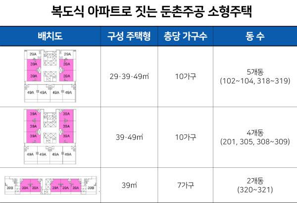 소형주택을 배치한 동은 전체 85개동 중 11곳이다. 먼저 29·39·49㎡ 세 가지 주택형을 섞어서 배치하는 5개동은 한 층을 10가구가 같이 쓴다. 39㎡·49㎡ 두 개의 주택형으로 구성되는 4개동 역시 10가구가 복도를 공유하는 구조며, 39㎡로만 짓는 2개동은 한 층에 7가구를 배치한다.