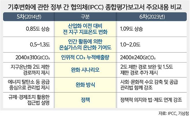 보고서는 인간 활동으로 배출된 온실가스가 기후변화의 주요 원인이라고 지적하면서 이 같은 분석을 내놓았다. 이번 보고서는 2018∼2019년 나온 세 종류의 특별보고서와 2021∼2022년 발표된 제1·2·3차 실무그룹 보고서를 종합 발간한 것으로, 기후변화 현황 및 과학적 규명(1차), 향후 전망과 적응 방안(2차), 완화법(3차)을 총망라했다.