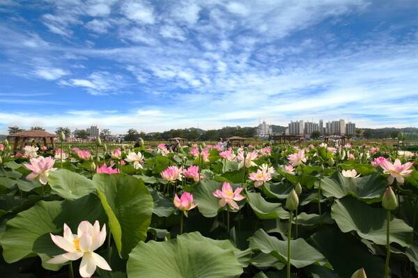 서울 인근 대규모 연꽃 군락지를 만나볼 수 있는 시흥 연꽃 테마파크입니다. 시흥 연꽃 테마파크는 조선 세조 때 문신이자 농학자인 강희맹이 중국서 연씨를 들여와 처음으로 심었던 연꽃의 발상지라는 의미 있는 곳입니다.