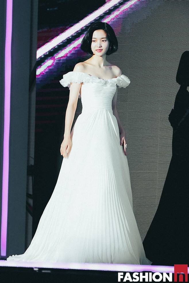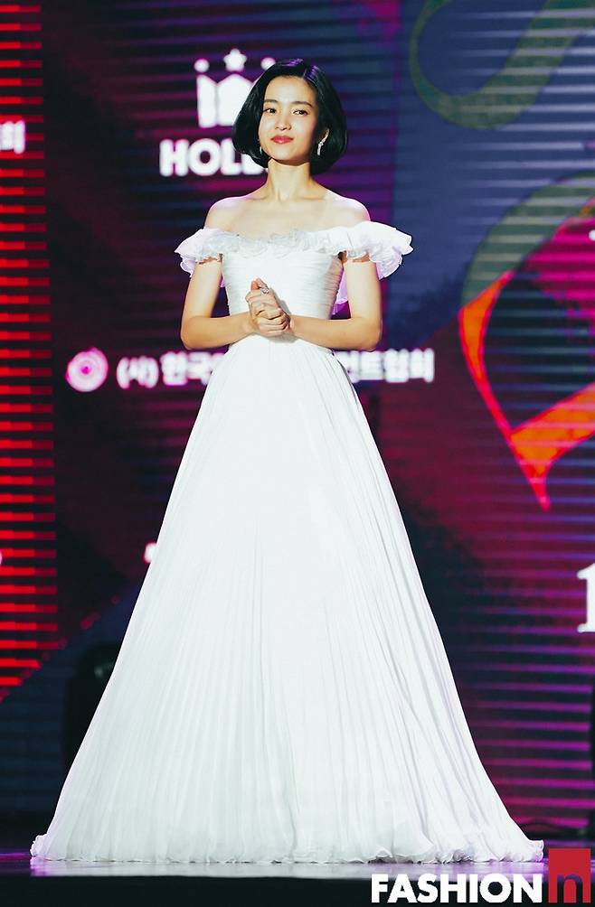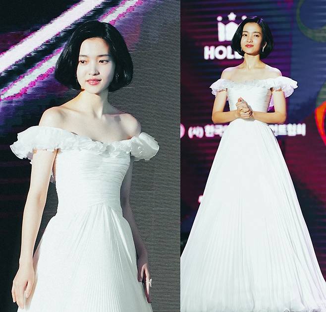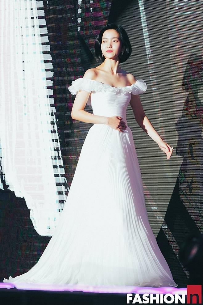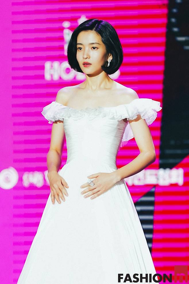 이날 김태리는 화이트 오프숄더 A핏 드레스룩으로 동화 속을 뚫고 나온 듯한 마네킹 미모를 드러냈다.