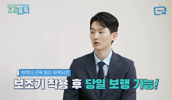 허벅지 앞쪽 근육의 힘이 회복되면 보조기를 착용 후 당일 보행도 가능합니다.