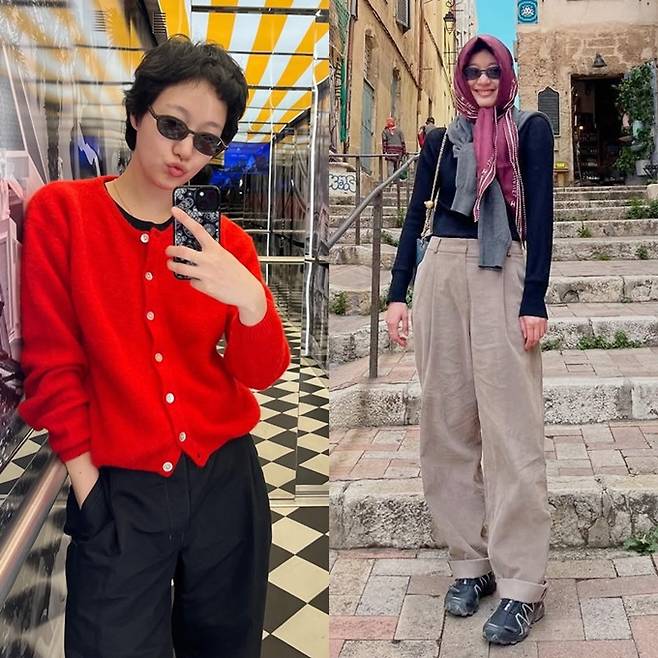 공개한 사진에서 김고은은 블랙 팬츠와 화이트 티셔츠에 강렬한 레드 컬러의 니트 카디건을 착용한 모습과 데님 팬츠에 트위드 재킷을 걸친 모습, 또 스카프를 머리에 스웨터를 어깨에 두른 편안하면서도 캐주얼한 차림의 꾸안꾸 스타일로 여행을 만끽하는 모습을 노출했다.