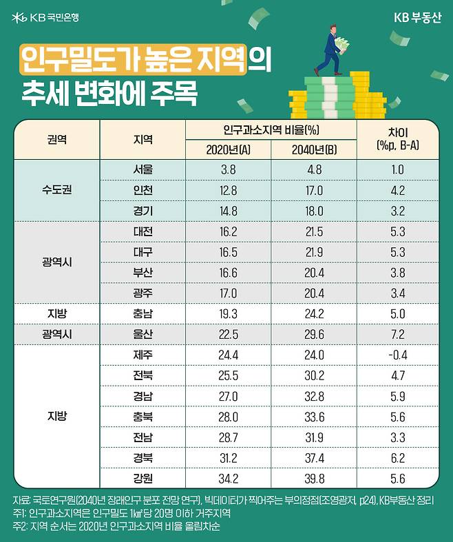 지난주 조연구위원은 부동산에서 과대평가된 인구 변수보다 인구밀도와 인구 이동에 집중할 필요가 있다는 의견을 내놓았습니다. 그리고 인구밀도와 주거 수요에 모멘텀을 제공하는 상위10% 소득을 비교했습니다. 참고로 ‘국토연구원 인구과소지역 분석’을 살펴보면 수도권의 과소 지역 비율이 낮았고(인구밀도가 높고), 2040년까지 변화도 적었습니다.