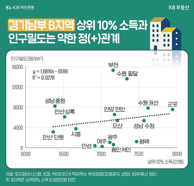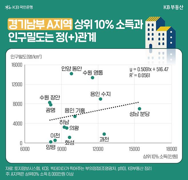 경기남부 상위10% 소득 8,000만원 이상 지역의 인구밀도는?