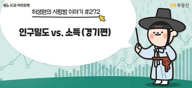 지난주 강북권역 14개구, 강남권역 11개구의 상위10% 소득과 인구밀도를 비교했을 때 부(-)관계를 확인한 바 있죠. 그런데 경기남부 상위10% 소득이 8,000만원 이상인 지역과 인구밀도를 비교했을 때는 정(+)관계가 나타납니다. 경기도와 서울 간 상관관계가 다른 이유가 무엇일까요?