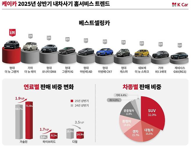 K Car(케이카)는 온라인 구매 서비스 `내차사기 홈서비스`의 올해 상반기 판매 데이터를 분석한 결과, 상위 10선을 중대형 세단과 경차가 양분한 것으로 나타났다고 지난 15일 밝혔다.