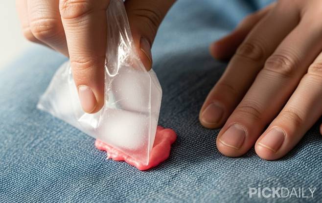 가장 기본적이고 안전한 방법은 얼음으로 껌을 굳혀 제거하는 것이다. 얼음을 비닐봉지에 넣어 껌이 묻은 부위에 10분 정도 대면 껌이 단단히 굳는다. 이렇게 굳은 상태에서 숟가락이나 카드로 살살 긁어내면 쉽게 떨어진다.