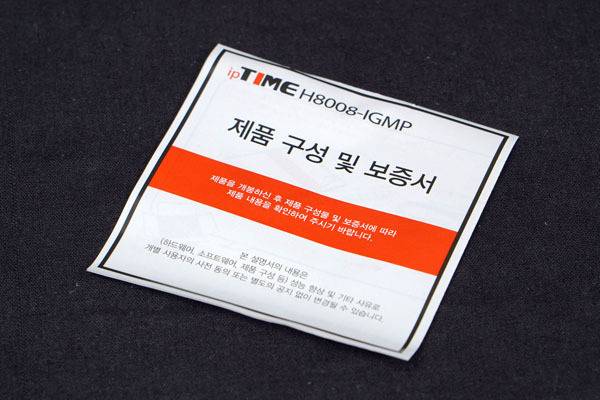 ipTIME H8008-IGMP는 제품 구성은 스위칭 허브 본체와 전원 어댑터, 그리고 제품 구성 및 보증서가 들어간다. 제조사인 EFM 네트웍스로부터 무상 2년의 A/S를 받을 수 있다.
