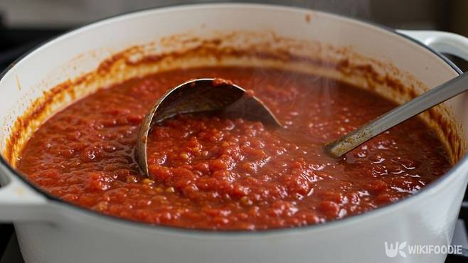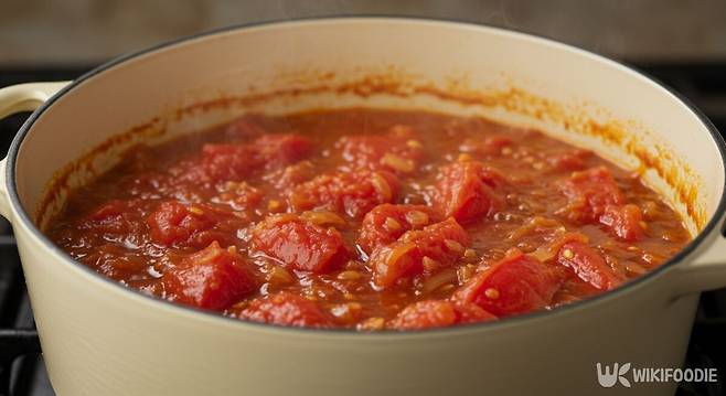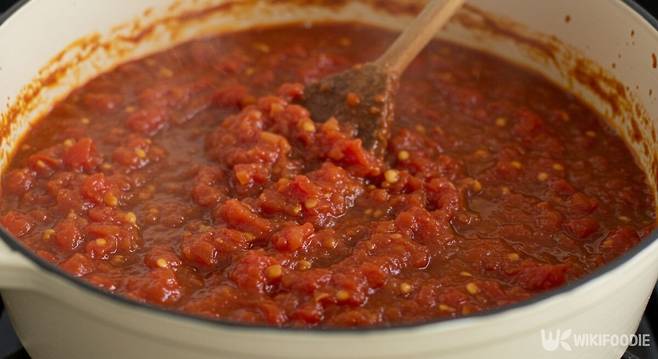 3분이 지나면 뚜껑을 열고, 바닥에 있는 내용물이 타지 않도록 가볍게 섞는다. 물 반 컵을 붓고 뚜껑을 덮은 뒤, 약불로 줄여 4~5분 더 익힌다. 이때 토마토 수분이 우러나면서 소스가 부드러워진다.