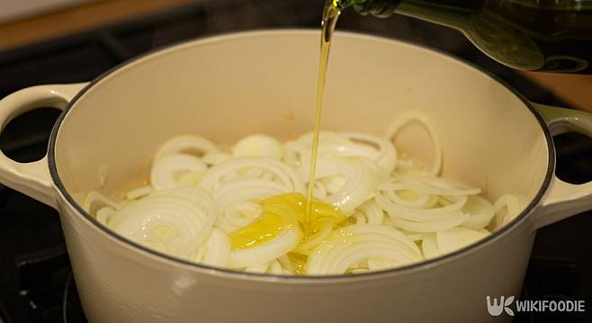 이제 바닥이 두꺼운 냄비를 준비한다. 얇은 냄비는 쉽게 눌어붙으니 피하는 것이 좋다. 썰어둔 양파를 냄비에 넣고 소금 3꼬집, 올리브오일 2큰술을 두른 뒤 중약불에서 볶는다. 양파가 투명해지고 부드러워질 때까지 5~6분간 볶는다.