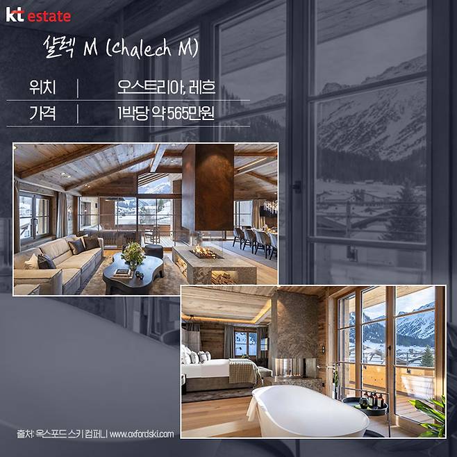샬렉 M은 리프트까지 도보 3분 거리에 위치해 있어 스키장 접근성이 뛰어납니다. 또한 전용 욕실을 갖춘 5개의 침실이 마련돼 있어 최대 10명까지 숙박이 가능하며, 최상층에 위치한 거실 공간은 오픈 구조로 돼 있어 개방감이 뛰어나고 연결된 발코니를 통해 멋진 전망도 볼 수 있습니다. 별도로 시네마룸, 사우나 시설 등도 갖추고 있습니다. 샬렉 M의 가격은 7일 기준 2만7520유로로, 1박당 3931유로(한화 약 565만원)입니다.
