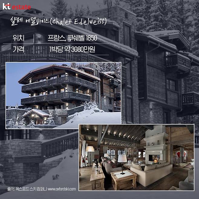 객실 문을 열면 바로 슬로프에 진입할 수 있는 스키인∙스키아웃 타입도 장점인데요. 리조트 내에 셰프 2명과 집사 2명, 운전사 등이 상주해 있어 최상의 서비스를 받을 수 있습니다. 가격은 7일 동안 15만 유로로, 1박으로 계산하면 2만1428유로(한화 약 3080만원)입니다. 그 외에 프랑스 발델제르 지역 내 샬레 첸(Chalet Chene), 메리벨 지역 내 샬레 라팡 블랑(Chalet Lapin Blanc) 등이 프랑스 럭셔리 스키 리조트로 언급되고 있습니다.