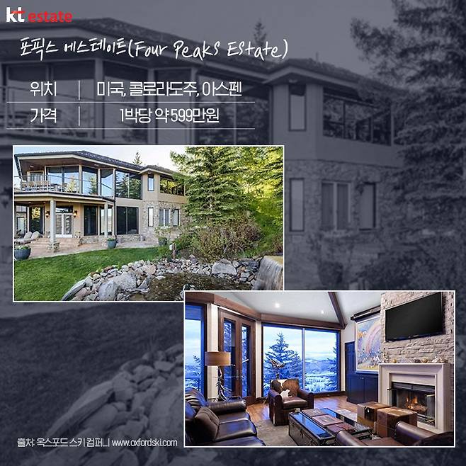 미국 스키 휴양도시에서 럭셔리하게 스키를 즐길 수 있는 포픽스 에스테이트의 이용 가격은 7일 기준 3만1500달러이며, 1박당 4500달러, 한화로 약 599만원입니다.