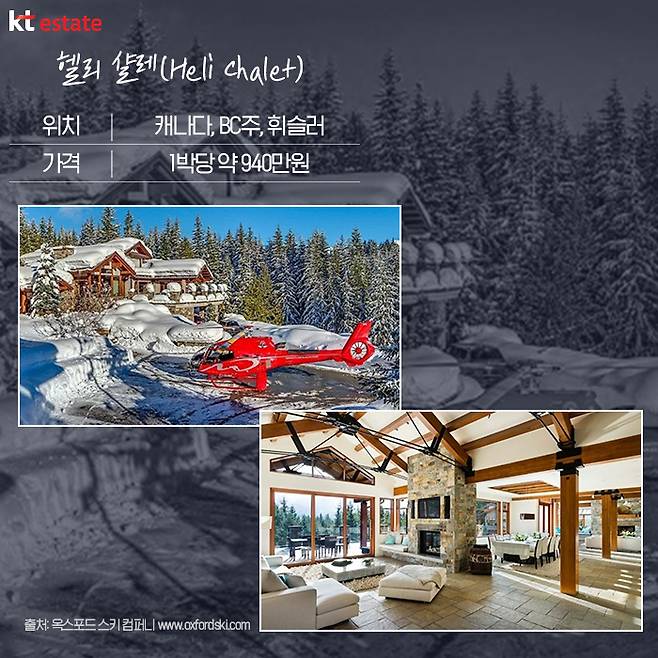 헬리 샬레를 이용하기 위해선 7일 기준 6만6500캐나다달러가 필요하며, 1박 기준 9500달러, 한화로 약 940만원입니다.