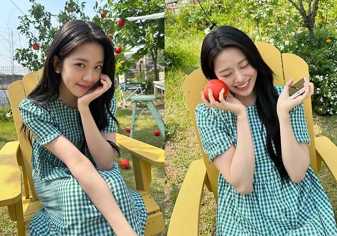 안유진은 그린 체크 원피스를 착용해 청순하고 상큼한 과즙 미모를 뽐냈습니다.
