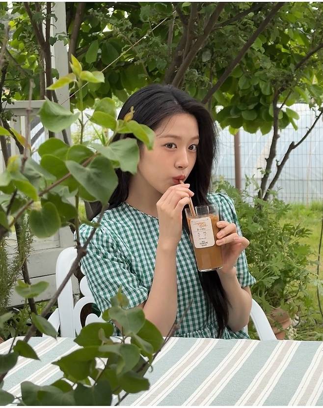 안유진은 그린 체크 원피스를 착용해 청순하고 상큼한 과즙 미모를 뽐냈습니다.