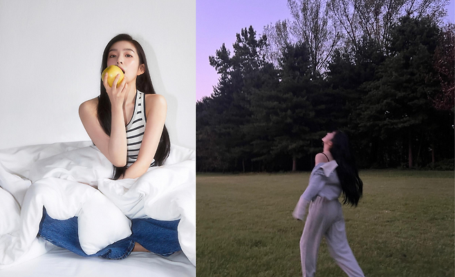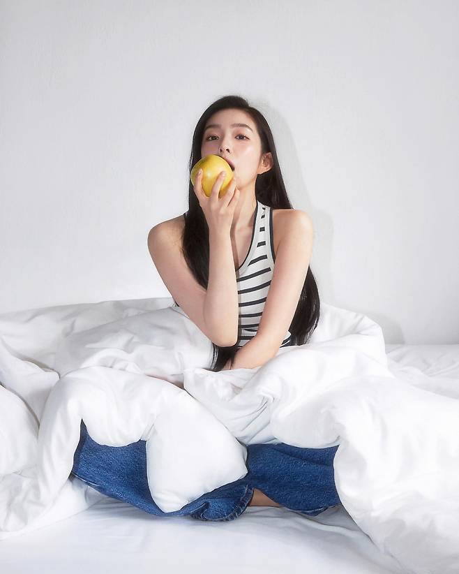 침실에서 포착된 아이린의 모습은 스트라이프 슬리브리스 톱과 데님 팬츠로 캐주얼한 매력을 발산하고 있다. 화이트 베딩과 조화를 이루는 깔끔한 색감 조합으로 일상 속에서도 세련된 감각을 드러내며, 사과를 들고 있는 자연스러운 포즈가 친근한 이미지를 연출하고 있다.