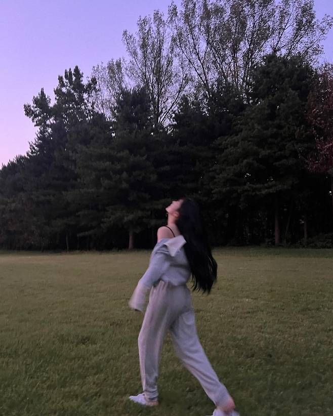 아이린이 연보라빛 석양을 배경으로 한 공원에서 선보인 스타일은 편안함과 우아함을 동시에 연출하고 있다. 오프숄더 디자인의 화이트 톱과 와이드 팬츠를 매치해 자연스러운 실루엣을 완성했으며, 긴 검은 머리가 바람에 날리는 모습으로 로맨틱한 분위기를 극대화하고 있다.
