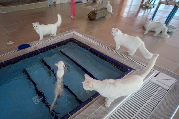 터키쉬 앙고라는 물을 좋아하는 고양이라서 싱크대나 샤워기에서 물이 떨어지는 소리만 들려도 달려갑니다. 터키쉬 앙고라가 얕은 연못, 개울, 호수 같은 곳에서 수영하는 모습을 볼 수 있고 자신감 넘치고 자신이 우위에 있는 걸 좋아하는 고양이라서 다른 동물들과 있을 때도 자신이 대장이라는 확신이 있으면, 쉽게 적응하는 편입니다.