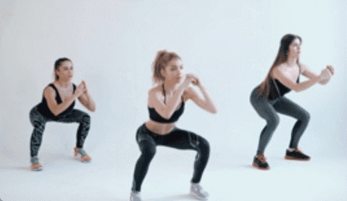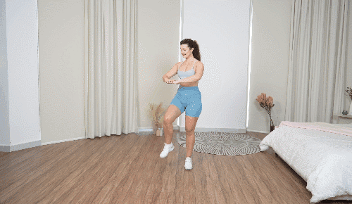 다리를 어깨너비보다 넓게 벌리고 손은 가슴 앞에서 모읍니다. 스쿼트 동작을 한 뒤 일어서며 오른쪽 무릎을 들어 올립니다. 이때 왼쪽 팔꿈치를 아래로 내려 무릎과 팔꿈치가 만나게 합니다. 반대쪽도 동일하게 반복합니다.