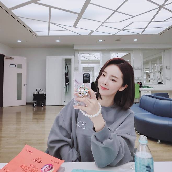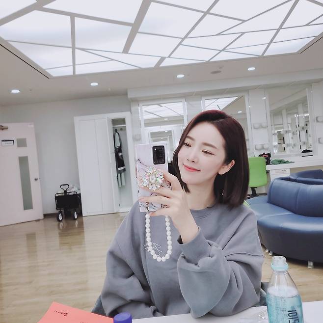 거울 앞에서 촬영한 사진 속 배슬기는 깔끔하게 떨어지는 단발 헤어스타일로 부드러운 분위기를 자아냈어요.